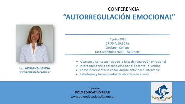El próximo miércoles 4 de julio de 2018 de 17:30 a 19:30 horas el Polo Educativo Pilar organiza la Conferencia “Autoregulación Emocional” con entrada libre y gratuita en Godspell College, Las Caléndulas 2600, Manuel Alberti, solamente se requiere inscripción previa obligatoria ingresando los datos aquí link: https://goo.gl/forms/THJ5VdtWHmNQMUem2